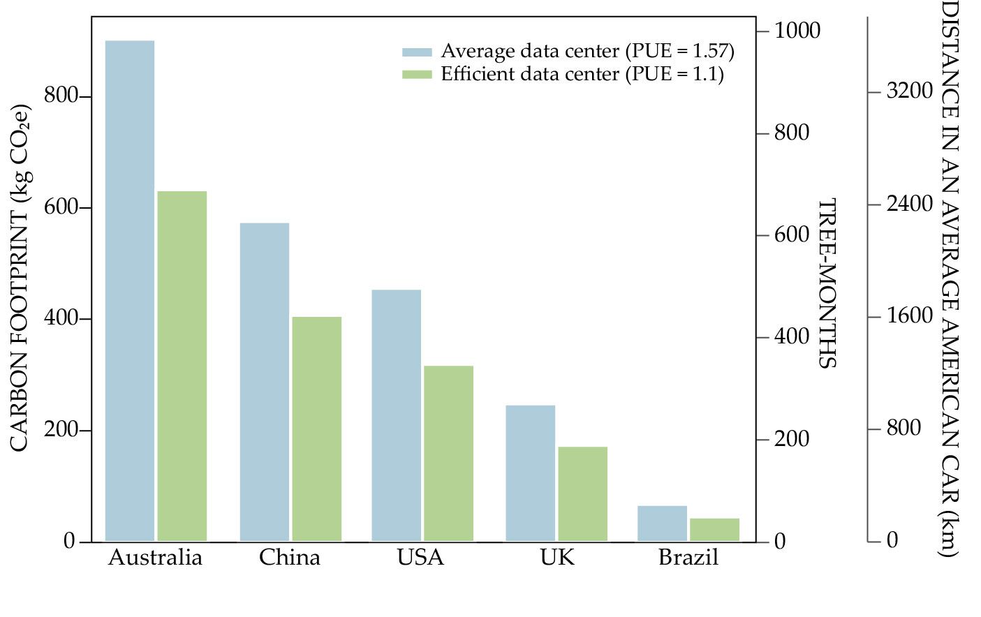 Greenhouse gas emissions from computing vary widely by location, depending on the energy source, and also on cooling and other design features. For a test calculation quantifying radiation damage to DNA, the blue bars show the values for an average data center for a given country and the green bars are for energy-efficient data centers in the same country. The power usage effectiveness (PUE) is a measure of the energy efficiency of the data center. At near right, the time it would take a tree to sequester the emitted carbon dioxide is shown. At far right is the distance that a car in the US would drive on average to emit the same amount of CO2 as the computation. (Courtesy of Loïc Lannelongue; data and details at https://www.carbonfootprint.com/international_electricity_factors.html