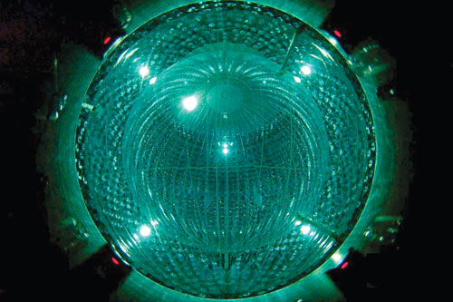 Figure 1. At the Borexino detector, pictured here, solar neutrinos are detected in a 14-m-tall sphere filled with 278 tons of liquid scintillator. Incident neutrinos are heralded by bursts of light emitted as they scatter off the scintillator’s electrons. (Photo courtesy of the Borexino collaboration.)