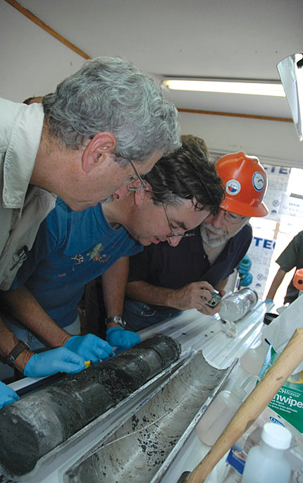 A section of core from the San Andreas Fault is examined by three principal investigators on the SAFOD project: from left, Mark Zoback, Stephen Hickman, and William Ellsworth.