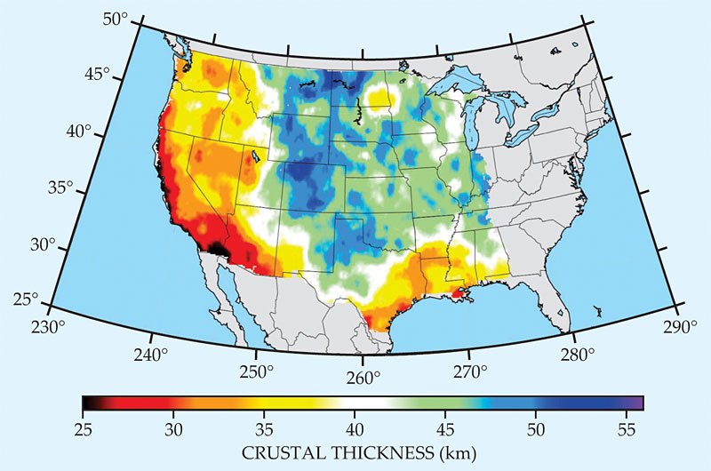 The thickness of Earth’s crust beneath the continental US as mapped using ambient noise tomography. The thickest portion, in the high Rocky Mountains and northern Great Plains, exceeds 50 km. The crust is less than 35 km thick in the geologically active western US and in the southern parts of the Great Plains. Data are not yet available for the eastern US.