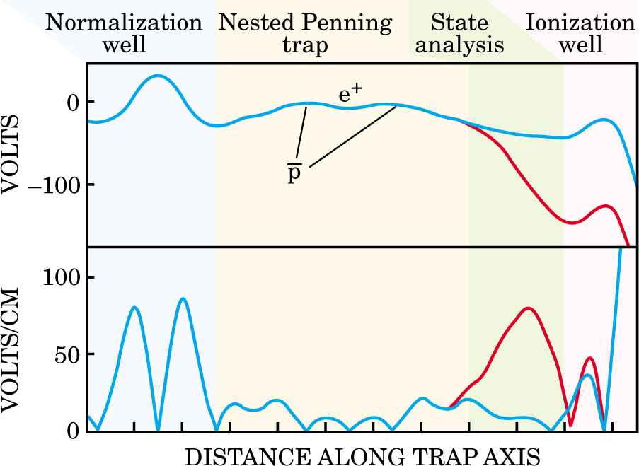 Antihydrogen detection scheme. Blue curves indicate the electric potential (top) and field magnitude (bottom) as a function of distance along the axis of a nested Penning trap. Positrons are held by a small dip in the potential at the trap’s center. The small peaks on either side of this potential dip confine antiprotons, which bounce back and forth through the positrons. If H¯ atoms are formed, some of those that escape are stripped of their positrons by an electric field in the ionization well. These antiprotons serve as a measure of the number of H¯ atoms formed. When an electric field applied in the state analysis region (red curves) ionizes some H¯ atoms, fewer antiprotons are caught in the ionization well, and the drop in numbers reflects how many H¯ bar atoms were formed in a given quantum state. The drop is found by comparison with the normalization well on the other side of the Penning trap.