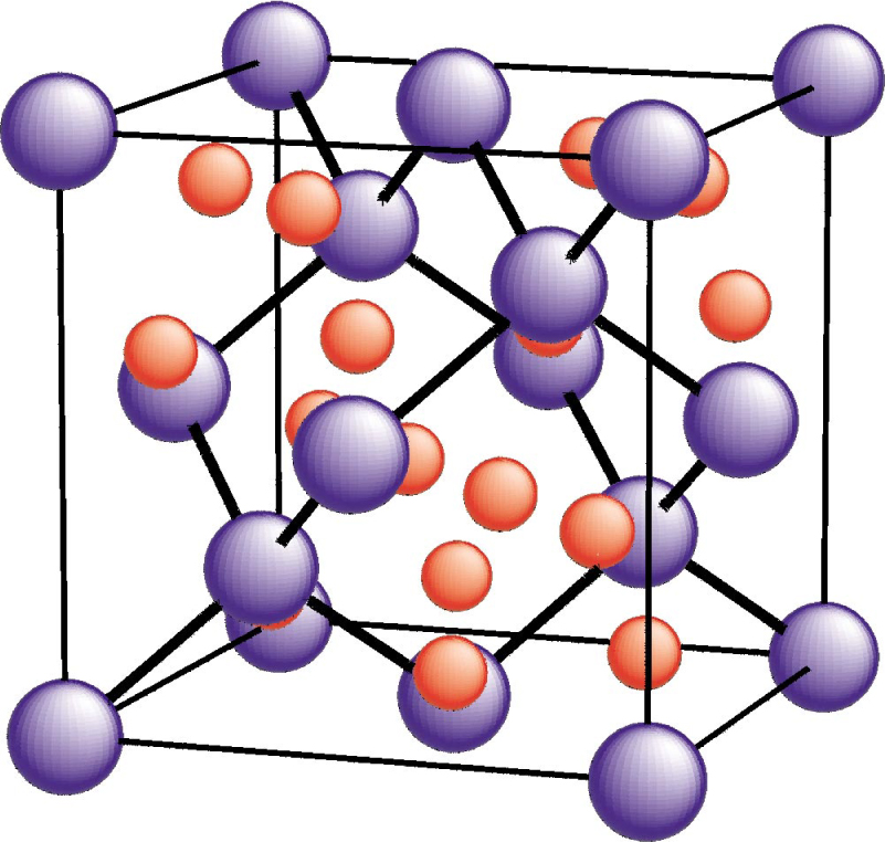 Figure 1. The zirconium atoms (violet) in the newly discovered ferromagnetic superconductor ZrZn2 form a tetrahedrally coordinated diamond stucture amid the zinc atoms (red).