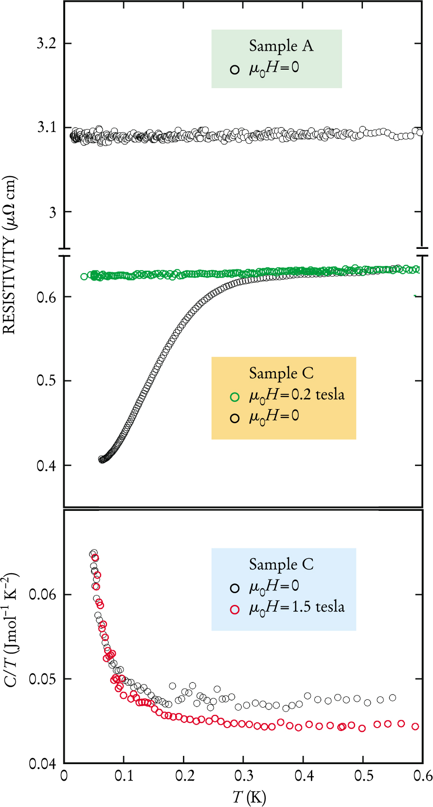 Figure 2. Resistivity and heat capacity measurements of two samples of ZrZn2. No superconducting transition was observed in sample A. But sample C, which is significantly purer, does have a superconducting transition at 0.3 K. The transition is suppressed by an external magnetic field of 0.2 T. Heat capacity measurements performed on sample C do not reveal an anomaly at the superconducting transition temperature.