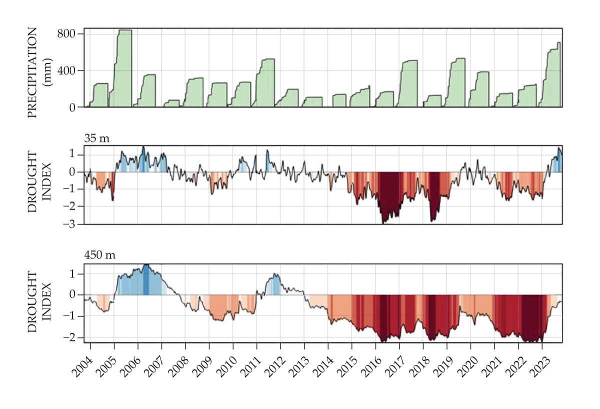 The researchers found that after several years of drought, the exceptionally rainy year of 2023 did a good job of replenishing near-surface groundwater, but deeper water reserves remained significantly depleted. In a future of increasingly unsteady rainfall, their method may be a useful tool to guide water management decisions.