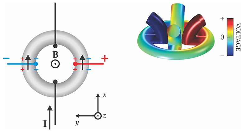 Figure 2. Why the Hall voltage flips. With the current I in the x direction and the magnetic field B in the z direction, as shown here, an n-type semiconductor produces a local Hall-voltage gradient in the +y direction. But because of the way the rings are linked, the ring on the +y side picks up a negative potential and the ring on the −y side picks up a positive potential. The simulated potential map on the right shows the same region in more detail. (Adapted from refs.