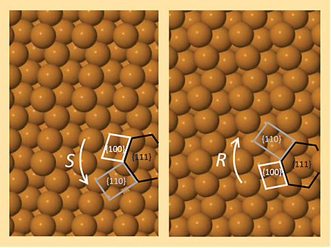 Shedding light on chiral substrates. Most biological molecules naturally occur as either left-handed (S) or right-handed (R) nonidentical mirror images known as chiral enantiomers. Many drugs come in chiral pairs; therefore, pharmaceutical companies are keen to produce chirally pure medicines that bind to their intended target without subjecting the body to the other, unwanted, and in some cases harmful, enantiomer. One novel technique for separating drug mixtures is to pass them over a chiral substrate, typically a metal oxide, that selectively adsorbs specific enantiomers. But in order for researchers to understand the adsorption dynamics, they must first elucidate the substrate’s chiral orientation. Low-energy electron diffraction techniques can be used, but they cannot easily distinguish orientation if the unit cell of the surface is itself achiral. Now, researchers at the Australian Synchrotron, La Trobe University, and the University of Newcastle have shown that chiral orientation can be identified by photoemission techniques. The researchers used 600-eV x rays to excite photoelectrons from a chiral copper substrate, whose S and R orientations are modeled in the images. After measuring the photoemission from multiple angles, they were able to identify the chiral orientation by overlaying the emission distribution, which reflects the substrate’s bulk symmetry, onto geometric lattice projections of the two possible chiral structures. The researchers also showed that chiral orientation can be determined by measuring the photoemission from the Fermi level of substrates that were excited at 200 eV. (