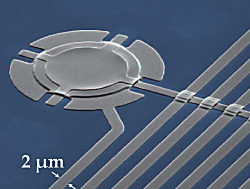 Sidebands get to the mechanical quantum ground state. Last year researchers at the University of California, Santa Barbara, demonstrated quantum effects in the motion of a macroscopic object. They achieved control of phonon energy states in a high-frequency (6-GHz) micromechanical oscillator after cryogenically cooling it to its ground state. Now, researchers at NIST, JILA, and the University of Colorado at Boulder have employed photon–phonon coupling to reduce the vibrational energy of a low-frequency (10-MHz) micromechanical oscillator to the ground state. Their setup consisted of a flexible 15-μm-diameter aluminum membrane (the gray disk in the image) coupled to a superconducting microwave resonant circuit. After cooling their system to 15 mK, the researchers applied a microwave field at a frequency just below resonance, generating so-called sideband photons that effectively steal energy from the membrane’s phonons. For applied photon numbers on the order of 104, the oscillator’s motion enters the quantum regime, possessing on average less than one phonon. The researchers also detected the oscillator’s displacement with a precision that comes closest to date to the theoretical Heisenberg limit. The low-frequency system’s relatively longer phonon lifetimes and larger displacements could pave the way to storage of quantum information and generation of entangled states in mechanical systems. (