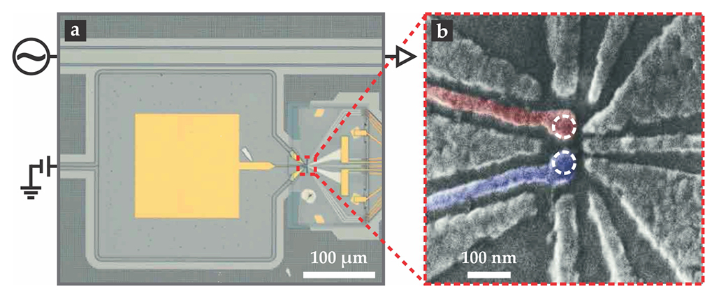 Qubit quantum electrodynamics. (a) The low-power source driving a microwave transmitter (top) ensures that the square cavity resonator capacitively coupled below it circulates no more than a single photon. (b) The resonator is connected to two gate electrodes (red and purple) atop a double quantum dot (white circles) in a heterostructure of silicon and silicon germanium. Voltages on surrounding electrodes pull a single electron into the double dot. (Adapted from ref. 2.)