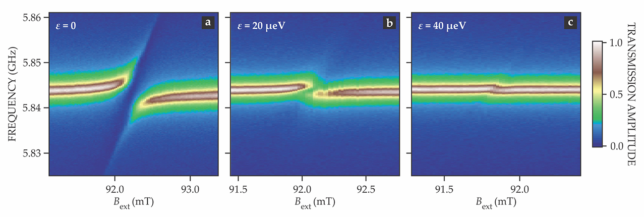 To reach the regime of strong coupling, the researchers also had to equalize the energy of a spin flip and the photon. To do so, they applied another magnetic field—a larger, tunable, external field Bext. Pointed in the same direction as the Co micromagnet’s field, Bext sets the electron’s Zeeman energy—that is, the energy difference between its spin states. The two groups swept the field’s magnitude while monitoring the transmission of the microwave circuit (figure 2a shows data from the Princeton group). Once the Zeeman energy and photon energy came into resonance, a pronounced “avoided level crossing” appeared—a telltale sign of strong coupling.