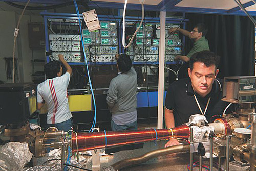 The Centre for Quantum Technologies is among the research groups at the National University of Singapore. Here, Kai Dieckmann inspects part of an experiment for studying ultracold mixtures of fermionic and bosonic atoms. Behind Dieckmann are members of his group, Kanhaiya Pandey (left), Tarun Johri (center), and Johannes Gambari.