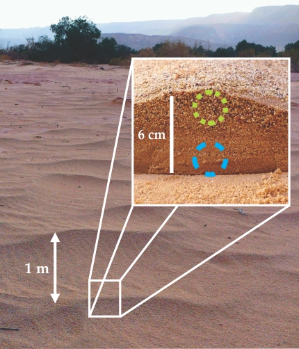 Inside a megaripple. A cross section of a typical megaripple reveals vertical sand grading (inset), with coarse grains on top (green) and mixed bulk below (blue). (Adapted from ref. 1.)