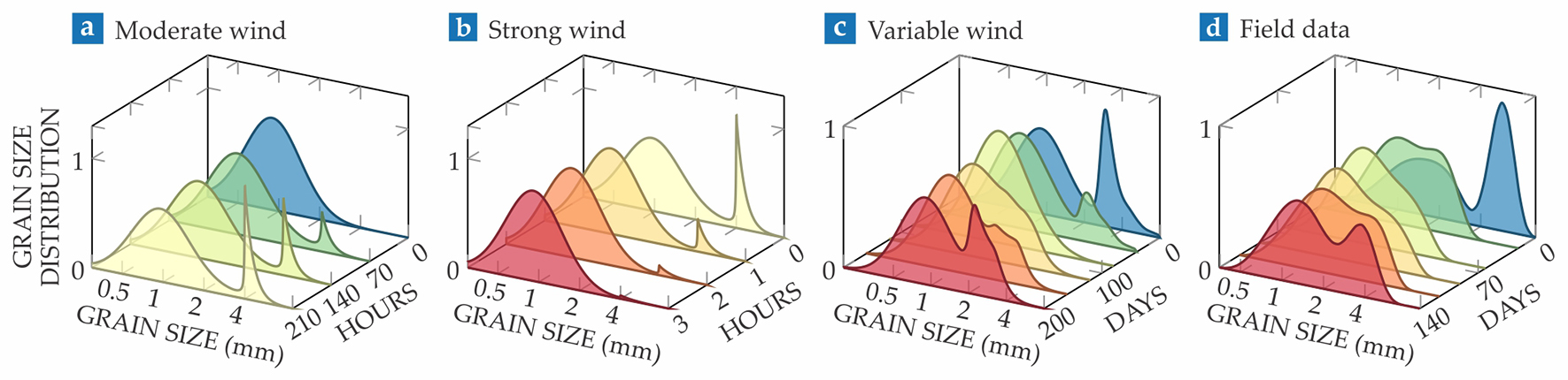 Of course, actual wind speeds are variable. The variable wind profile shown in figure 3c takes almost 100 days to erode the initial megaripple. By 200 days, another megaripple has begun to form. The average wind speed is assumed to be 25% of the moderate wind in figure 3a, and 10% of the wind speed during a storm. That grain distribution is similar to that observed in the Negev region (figure 3d).
