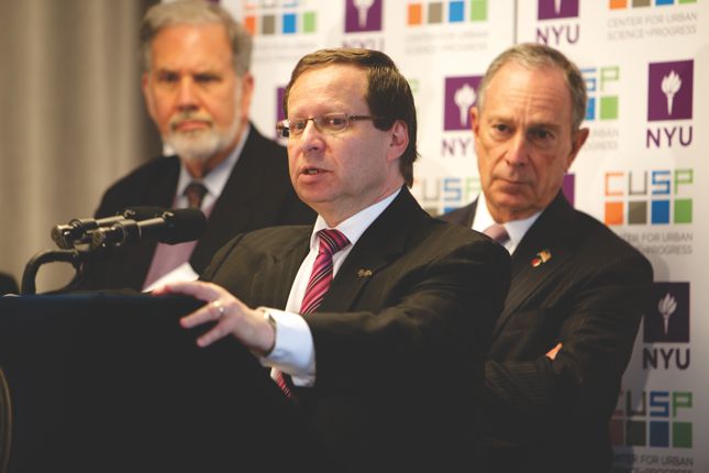 Steven Koonin, director of New York University’s Center for Urban Science and Progress, at a ribbon-cutting ceremony at the center’s Brooklyn offices in April. Looking on are NYU president John Sexton (left) and New York mayor Michael Bloomberg.