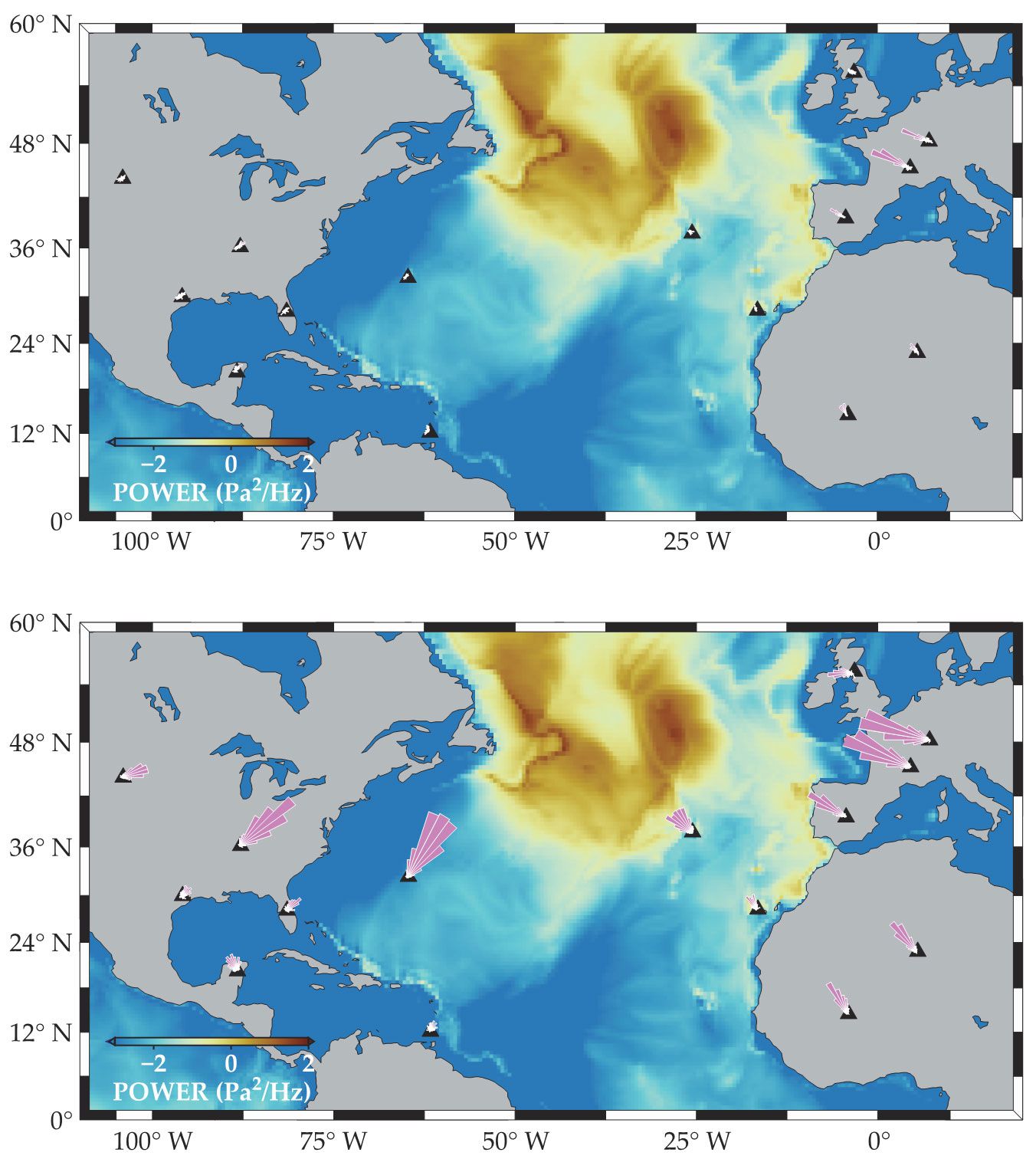 A state-of-the-art Earth model simulated secondary-microseism Love waves, the shear motion that arises when ocean waves interact nonlinearly with each other. The ocean color indicates the intensity of the pressure sources. The direction and strength of Love waves are indicated by the polar histograms at various detecting stations (black triangles). The top-panel simulation assumes a simple, layered Earth structure and shows only a few Love waves (pink bars) arriving at a handful of stations in Europe. The bottom panel shows results from a simulation that includes three-dimensional variations in seismic-wave velocity produced by a heterogeneous Earth structure. That distribution and number of Love waves better match observations. (Adapted from ref.