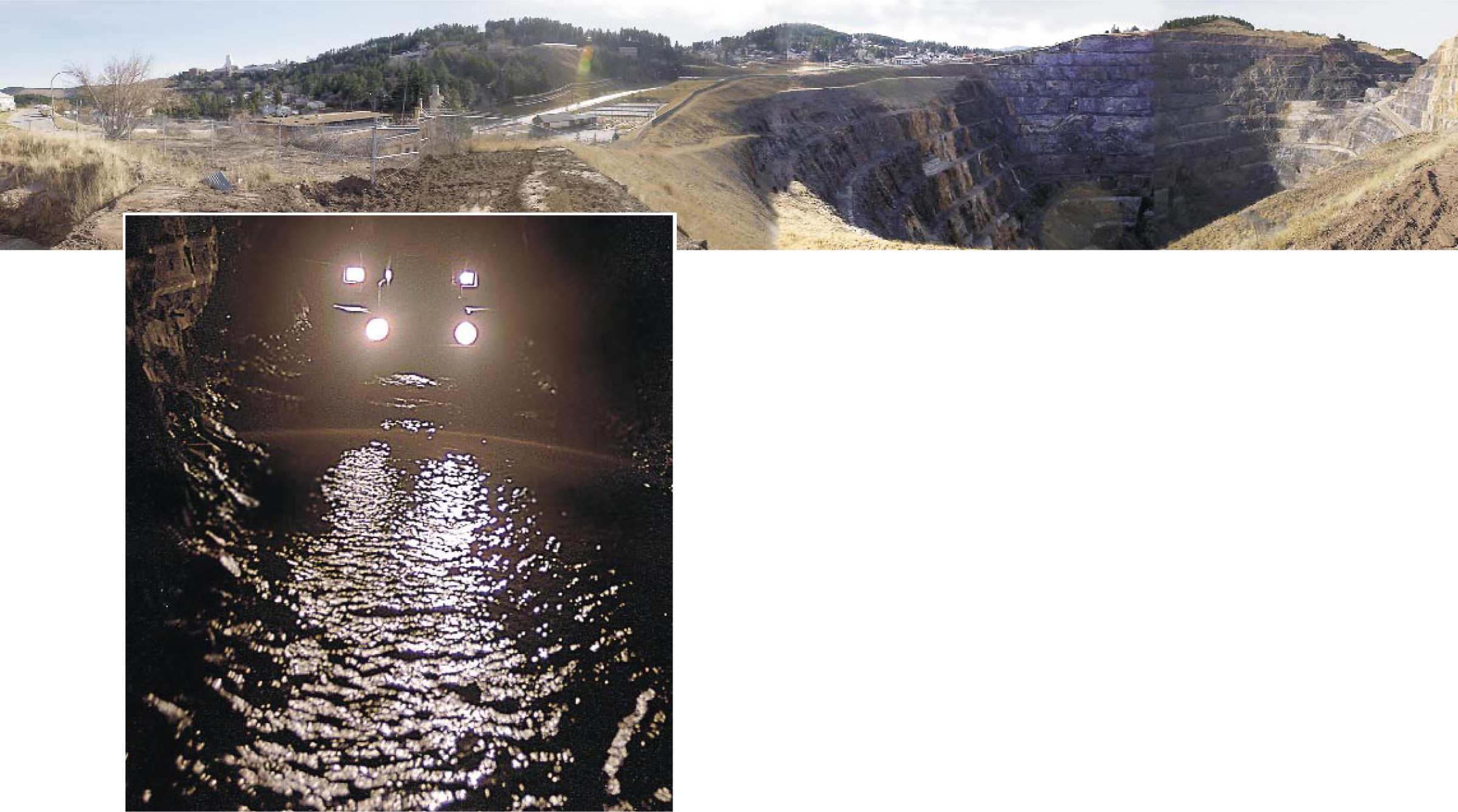 This composite panorama of the Homestake mine near Lead, South Dakota (top), shows the “open cut” on the right and the mine buildings on the left. Headlights from a tractor transporting miners deep in the mine in 1998 reflect off water that sometimes accumulated during normal operations. Pumps that kept the water under control have been shut off.