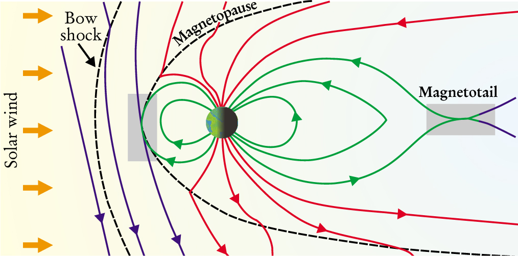 The Sun’s magnetic field reverses its overall polarity every 11 years, but the solar wind seethes with a variety of transient structures that change the field’s local direction at Earth on much shorter time scales. Where Earth’s more stable field abuts the solar field, the conditions for reconnection arise in two zones: at the magnetopause, the Sunward-facing nose of the magnetosphere, and in the magnetotail, its stretched out nightside tail (see figure 2).