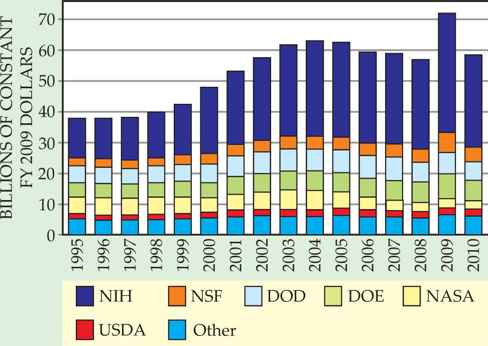 Trends in research by agency, FY 1995-2010 Federal support for basic and applied research will fall from a record high of $71.9 billion this year to $59 billion in fiscal 2010, under the budget proposed by President Obama. Excluding the $13.3 billion that was appropriated earlier this year in the American Recovery and Reinvestment Act, some of which will be spent in FY 2010, year-to-year spending would rise 0.4%. The Obama request would add considerably to R&D programs that promote clean forms of energy and mitigate climate change. Department of Defense R&D would be pared nearly $2 billion, or 2%, with nonmilitary R&D seeing an increase of $2.2 billion, or 3.6%. The Obama administration has pledged to continue an effort begun by President George W. Bush in FY 2007 to double the budgets of key basic physical sciences research programs by 2016. Obama has promised further growth for R&D in the years ahead as he aims for the US to achieve a spending level equal to 3% of gross domestic product. The federal government today pays for about one-third of total US R&D.