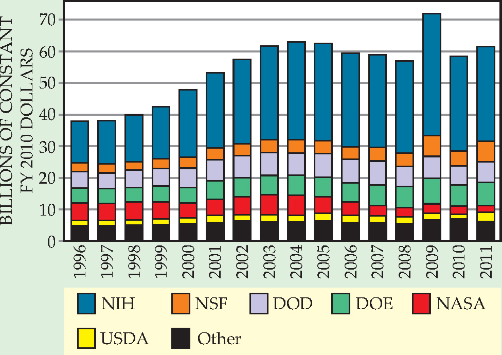 Obama also has parted ways with Bush on budget treatment for the National Institutes of Health. Upon the 2003 completion of a five-year budget-doubling campaign started by his predecessor, no further increases for NIH were provided through the remainder of Bush’s presidency. Obama has proposed an increase of $1 billion, or 3.2%, which would take the biomedical research behemoth’s FY 2011 budget to $32.2 billion, just under half of the total federal funding for non-defense R&D.