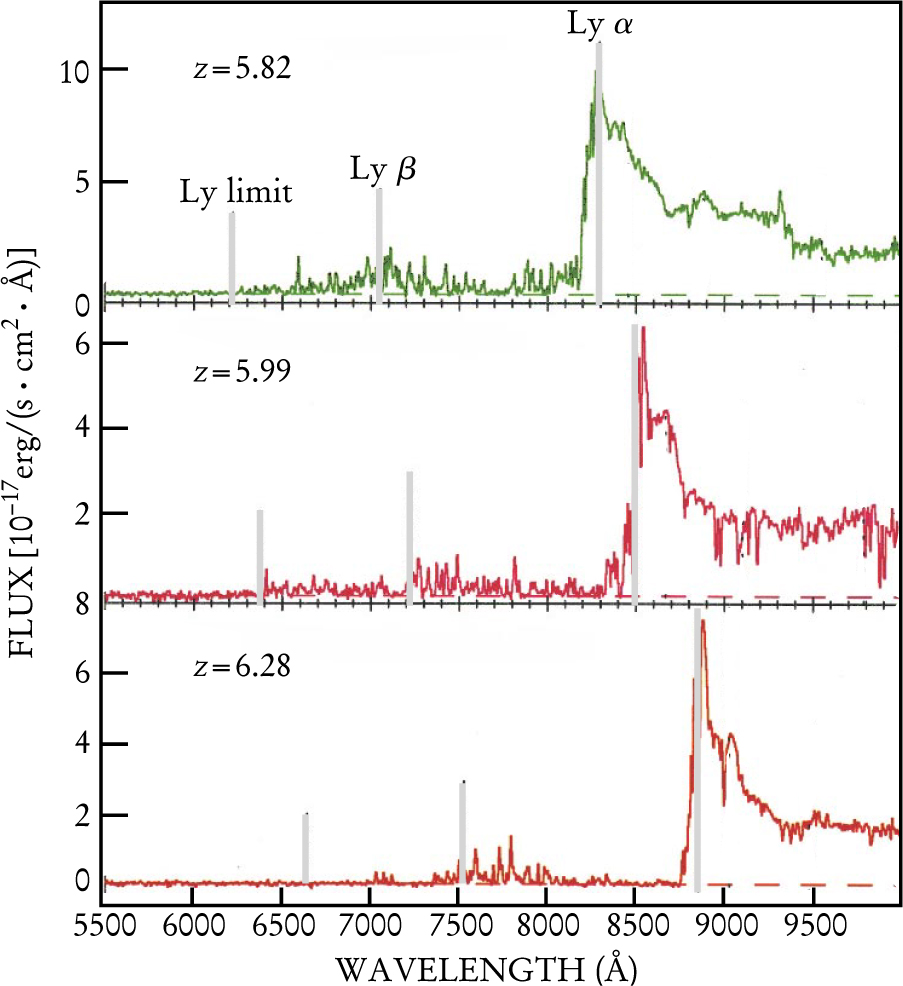 Figure 1. Spectra of the Sloan survey’s three highest-redshift quasars, in the vicinity of the redshifted α and β lines of the hydrogen Lyman excitation series and the Lyman ionization limit. In the spectrum of the z = 6.28 quasar (bottom panel) the absence of any discernible flux between 8450 Å and the prominent Ly-α peak appears to be the first observation of a Gunn–Peterson trough.