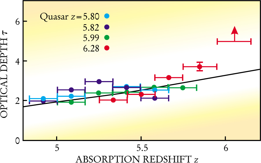Djorgovski and company, having availed themselves of a six-hour exposure at the Keck II telescope to produce a very high signal-to-noise spectrum of the z = 5.73 quasar, found a revealing discontinuity that had not been evident in the earlier low-resolution spectrum: “a dramatic increase in the optical depth”