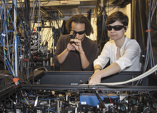 Monika Schleier-Smith (left) observes with an IR viewer as her student Emily Davis adjusts a pair of mirror mounts. In the background is a second table where the researchers cool and trap a cloud of rubidium atoms. Optical fibers carry light between the two parts of the experimental setup.