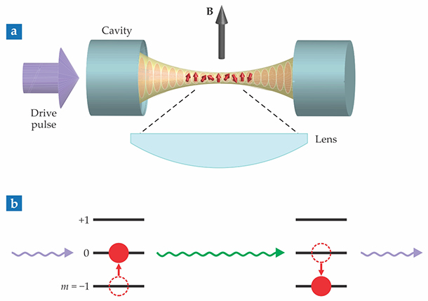 Spin-exchange interactions among atoms in an optical cavity. (a) A cloud of atoms (red) is held in a one-dimensional array of optical traps (orange). A magnetic field B induces Zeeman splitting, and the lens enables imaging of the cloud from the side. (b) When a photon (purple) from a drive pulse scatters inelastically off an atom, it changes the atom’s spin state and creates a virtual photon (green) of a different energy. The virtual photon then induces a spin change of equal and opposite energy elsewhere in the cloud. (Adapted from ref.