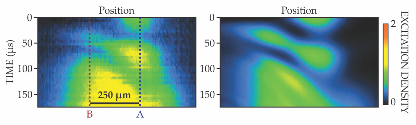 Nonlocal hopping of a spin excitation as captured by experimental data (left) and a theoretical model (right). The excitation was prepared at position A at time 0. Turning on the drive pulse causes the excitation to quickly hop to position B, closer to the cavity’s center. It then slides back to A, and at time 100 µs hops again. (Adapted from ref.