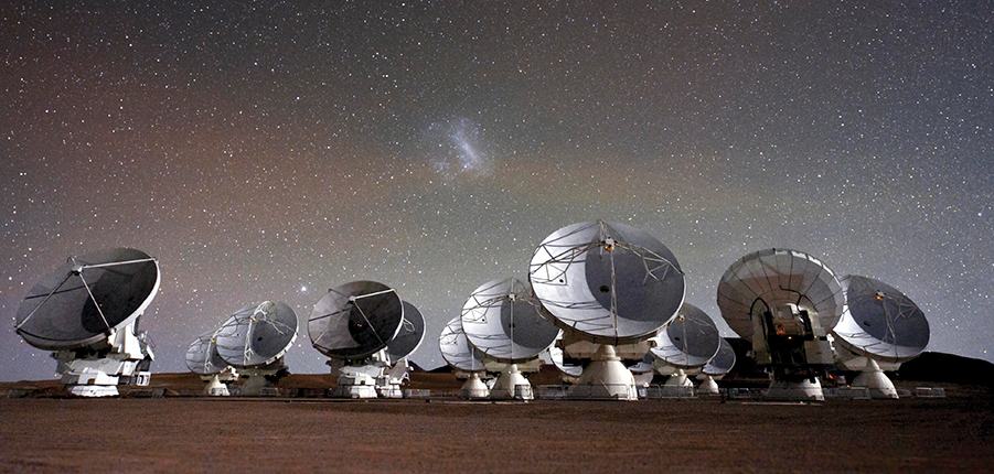 Figure 1. The Atacama Large Millimeter/Submillimeter Array, which consists of more than 60 antennas on a desert plateau in Northern Chile, is ideally suited to detect radio-wave emissions from the dust of distant stellar systems.