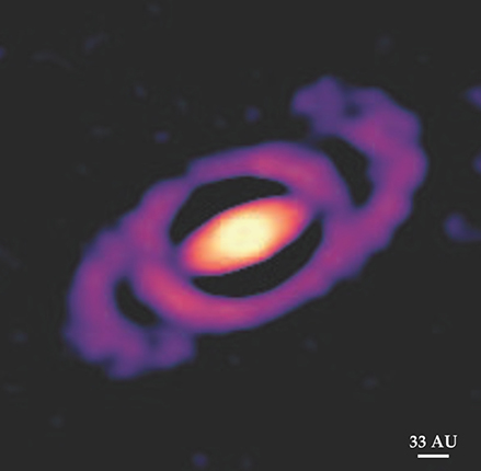 Pérez recalls that when the ALMA results came in, “one of the disks was odd. It showed features that we had never seen.” The disk, Elias 2-27’s, contained two symmetric spirals—a configuration known as the grand design. The spiral arms, shown in figure 2, emanate from a dense ring of gas and dust about 100 AU from the host star and spread out to nearly 300 AU, about seven times the distance from Pluto to the Sun.