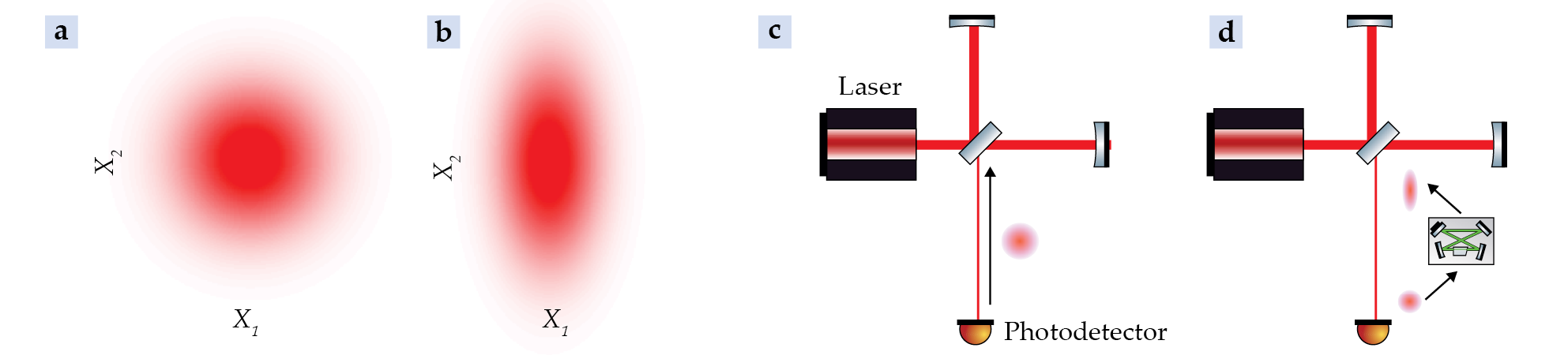 Squeezed light and interferometry. The quantum state of light can be depicted by probability distributions such as shown in (a) and (b). The so-called quadrature variables X1 and X2 here describe the electric field. Panel a gives the distribution of “vacuum fluctuations” for the ground state of the electromagnetic field; panel b gives the distribution for squeezed light. (c) The Michelson interferometer is the basis for Earth-based interferometers designed for detecting gravitational waves. The difference in arm lengths due to the passage of a gravitational wave is measured by monitoring the intensity of light on the photodetector shown at the bottom of the schematic. Vacuum fluctuations symbolized by the target shape enter an interferometer from the unused port (thin, red line) and cause quantum noise. (d) Reflections off a nonlinear cavity (inset) convert the vacuum fluctuations that would normally enter the interferometer to squeezed-vacuum fluctuations; the result is reduced quantum noise and improved measurement precision.
