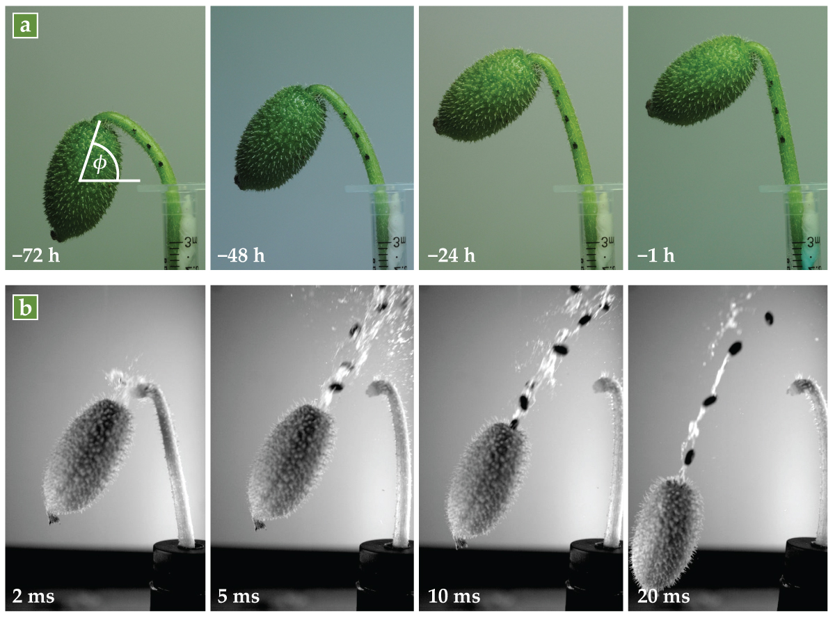 Seed ejection. (a) In the days before seed ejection, fluid pressure increases in the stem of the squirting cucumber; the pressure changes the orientation ϕ of the fruit and maximizes the distance traveled by the seeds. (b) Once the fruit breaks from the stem, it ejects all its seeds in a few hundredths of a second. (Image adapted from F. Box et al., Proc. Natl. Acad. Sci. USA 121, e2410420121, 2024.