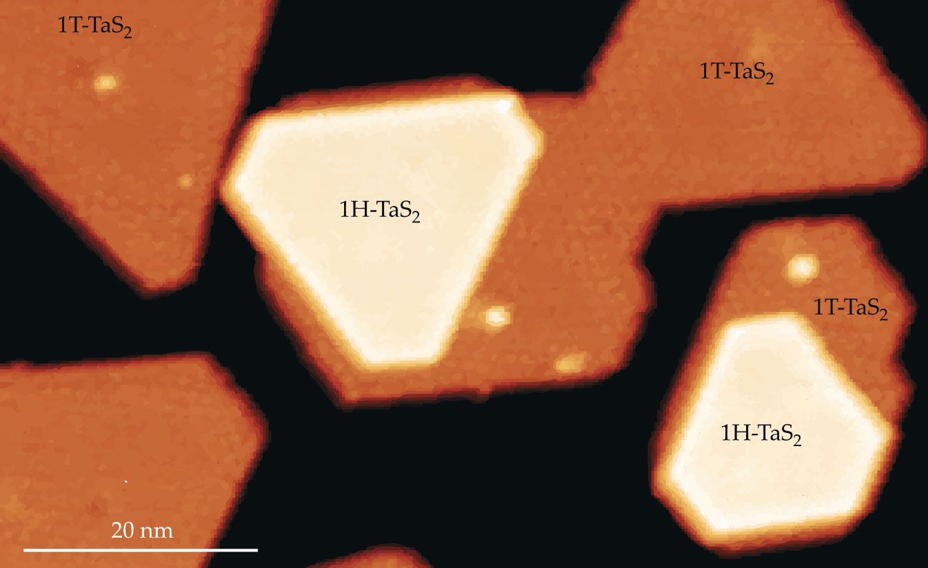 Liljeroth’s chosen growth process, molecular-beam epitaxy, produces monolayer islands of TaS2 with two possible crystal structures, denoted 1H and 1T. It also produces bilayer islands of the same layer structures and of differing structures: 1H stacked on 1T and vice versa, as shown in figure