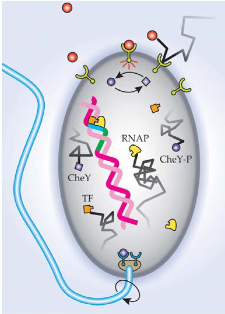 To avoid harm, Escherichia coli samples the concentration of certain molecules (orange circles). When those molecules bind to the cell’s external sensors, signaling molecules called CheY (purple squares) acquire a phosphate group to become CheY-P (purple circles). A protein complex at the base of the flagellum detects the increase in CheY-P concentration. When the concentration is high enough, the flagellum’s direction of rotation reverses to propel the cell to safety. Transcription provides another example of biomolecular detection. In response to an increase in a particular transcription factor (TF), a molecular motor (RNAP) begins transcribing a gene from DNA to RNA.