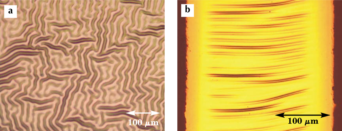 Figure 2. Gold deposited on silicone develops a wavy, wrinkled pattern because the silicone has a greater coefficient of thermal expansion than does gold. (a) On large areas, the wrinkles run in all directions. (b) But in stripes, the wrinkles line up perpendicular to the direction of the stripe.