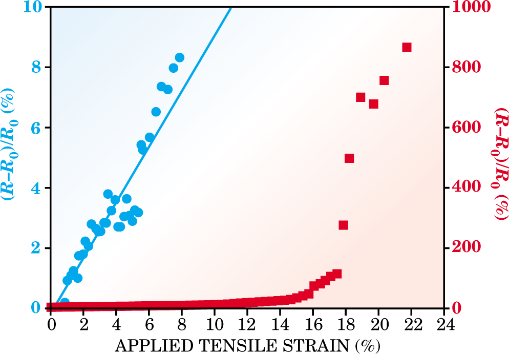 Figure 3. Resistance increases with applied strain in two regimes. Below a strain of about 8%, the increase is linear (blue points and left-hand scale). Above 8%, the increase accelerates (red points and right-hand scale), but even at a strain of 22%, the resistance remains finite.
