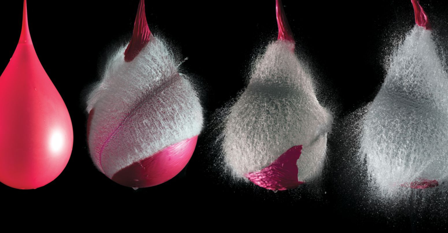 In the blink of an eye, a single pinprick can prompt an inflated balloon (shown here filled with water) to tear itself to shreds: The energy stored in the stretched latex is more than enough to power the rapidly propagating cracks. When less energy is available, damage in an elastic solid develops more slowly. The molecular details of material failure are key to how the process plays out. (Image by Jose Luis Stephens/Shutterstock.com.)