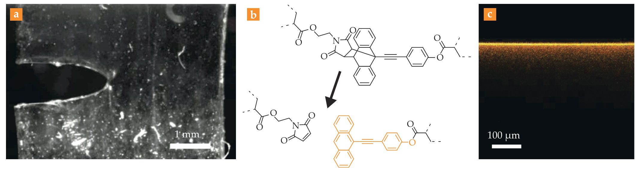 A molecular view of elastic fracture. A notched transparent elastic sheet (a) is put under increasing stress until it ruptures. (b) The sheet has been infused with molecules specially designed to break under tension. The orange portion of the broken molecule is fluorescent. (c) By placing the torn halves of the sheet under a fluorescence microscope, researchers can therefore visualize the spatial extent of molecular damage. Here, the fluorescence signal reveals that chemical bonds many tens of microns away from the nascent crack can still break. (Adapted from ref.