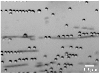 Many everyday materials, such as shampoo, ink, and coffee, are complicated mixtures of fluids and suspended particles with complex and often surprising internal interactions (see the articles by Alice Gast and William Russel, Physics Today, December 1998, page 24, and by Amy Shen and Perry Cheung, September 2010, page 30, and the Quick Study by Peter Yunker, Doug Durian, and Arjun Yodh, August 2013, page 60). For example, under shear flow (like the flow field you generate when you stir your coffee), the particles can attract each other and align in chains, as seen in this microscope image of 40-µm-diameter polystyrene beads in a solution of polyisobutylene and heptane. First reported nearly four decades ago, the chain behavior has been extensively explored, but a conclusive explanation for it has been elusive. Experiments by Jan Vermant and colleagues at the University of Leuven, Belgium, and ETH Zürich offer new insights into the underlying causes. The team prepared various fluids with polystyrene beads and sheared them between counterrotating top and bottom plates or between counterrotating, concentric cylinders and imaged the particles’ motion. The researchers found that although anisotropic normal-stress differences and confinement can each promote string formation, neither is essential. But shear thinning—the decreasing of viscosity at higher shear rates—is. Shear flow naturally causes suspended particles to spin. In “normal,” Newtonian fluids, particles that get sufficiently close will tumble together and eventually separate. In shear-thinning fluids, however, the viscosity decreases in the thin gaps between adjacent particles, enabling the particles to spin separately yet stay in line. (S. Van Loon et al., J. Rheol.58, 237, 2014, doi:10.1122/1.4853455.)