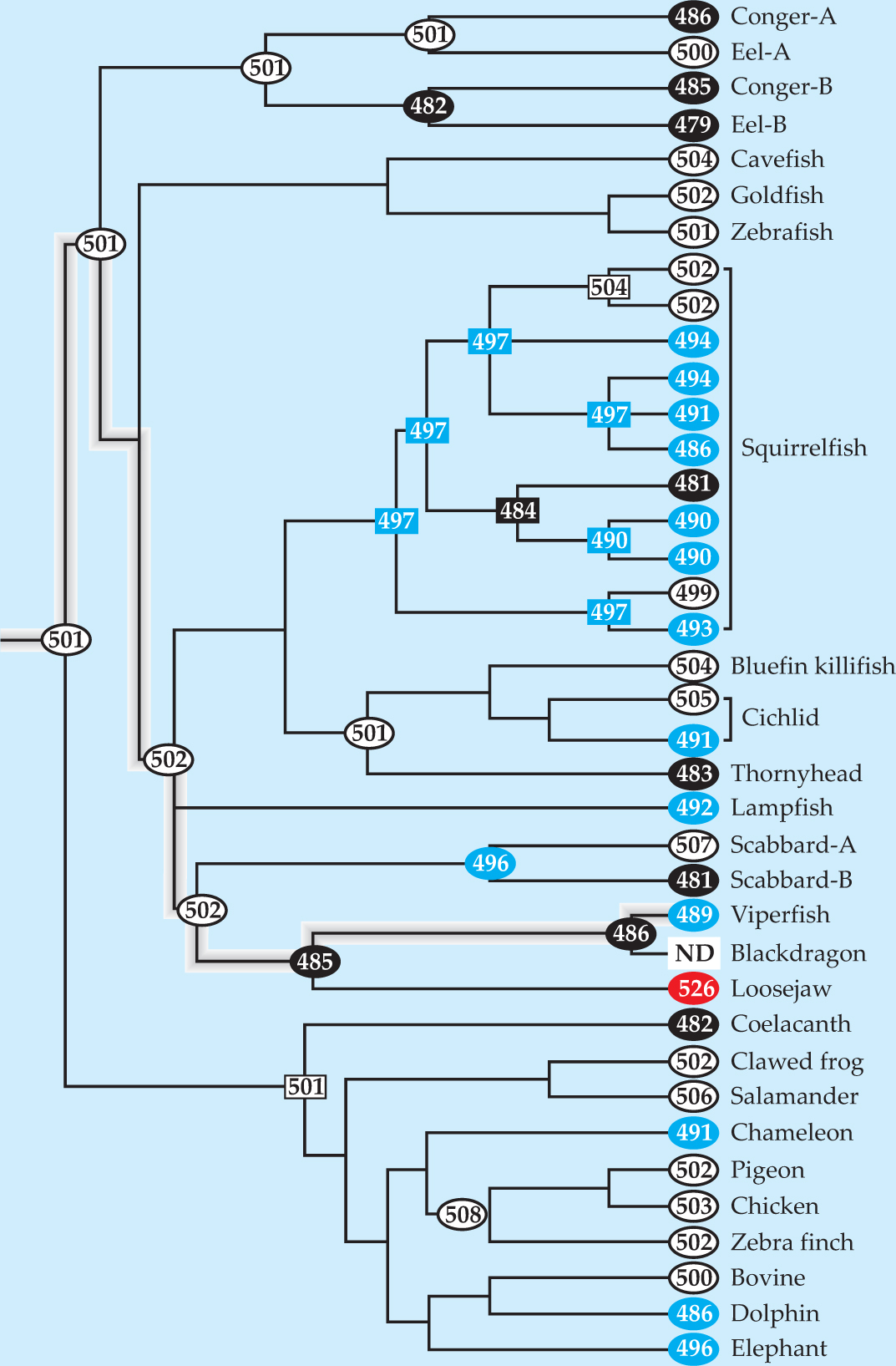 Figure 1. This family tree shows how 38 vertebrate opsins are descended from their common ancestor, an opsin from a prehistoric fish. Each node corresponds to an extant or extinct opsin, whose wavelength of peak absorption, λmax, is given in nanometers. For the fish, the colors indicate, based on λmax, the animal’s known or presumed habitat: white for shallow water or land, blue for deep water, and black for intermediate depths. The shining loosejaw’s opsin, indicated in red, is redshifted to sense IR. Having made and measured the opsins in the lab, Emory University’s Shozo Yokoyama and his team could infer a fish’s evolutionary path. The ancestors of the viperfish, for example, have occupied progressively deeper water. Ovals denote values measured directly in the lab; rectangles denote indirectly measured values.