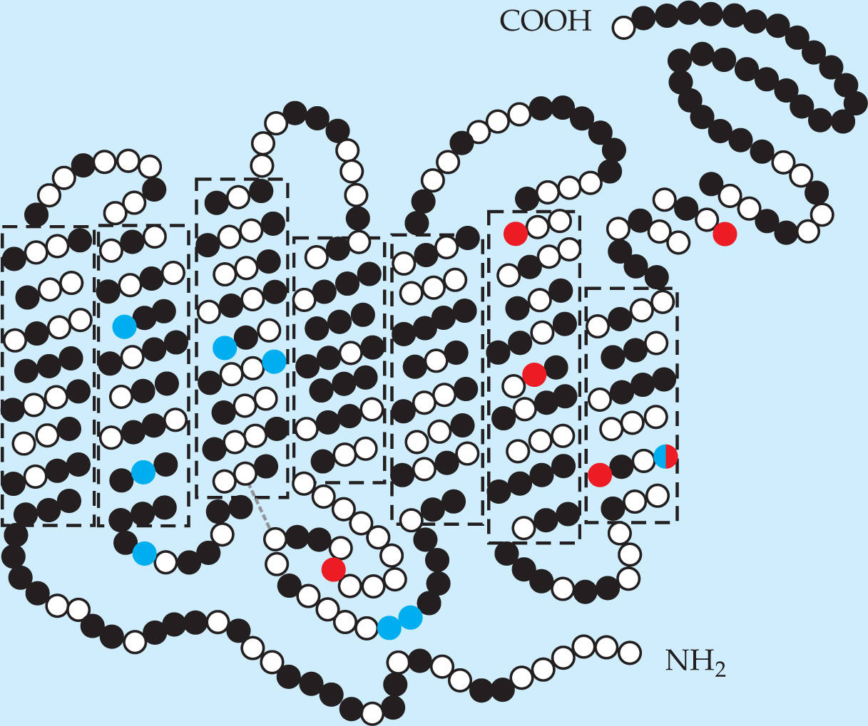 A flattened representation of bovine opsin appears in figure 2. Black, red, and blue dots indicate amino acid sites where the Emory team found substitutions in its opsin family tree. Substitutions at blue sites decreased λmax; substitutions at red sites increased λmax; substitutions at black sites left λmax unchanged.