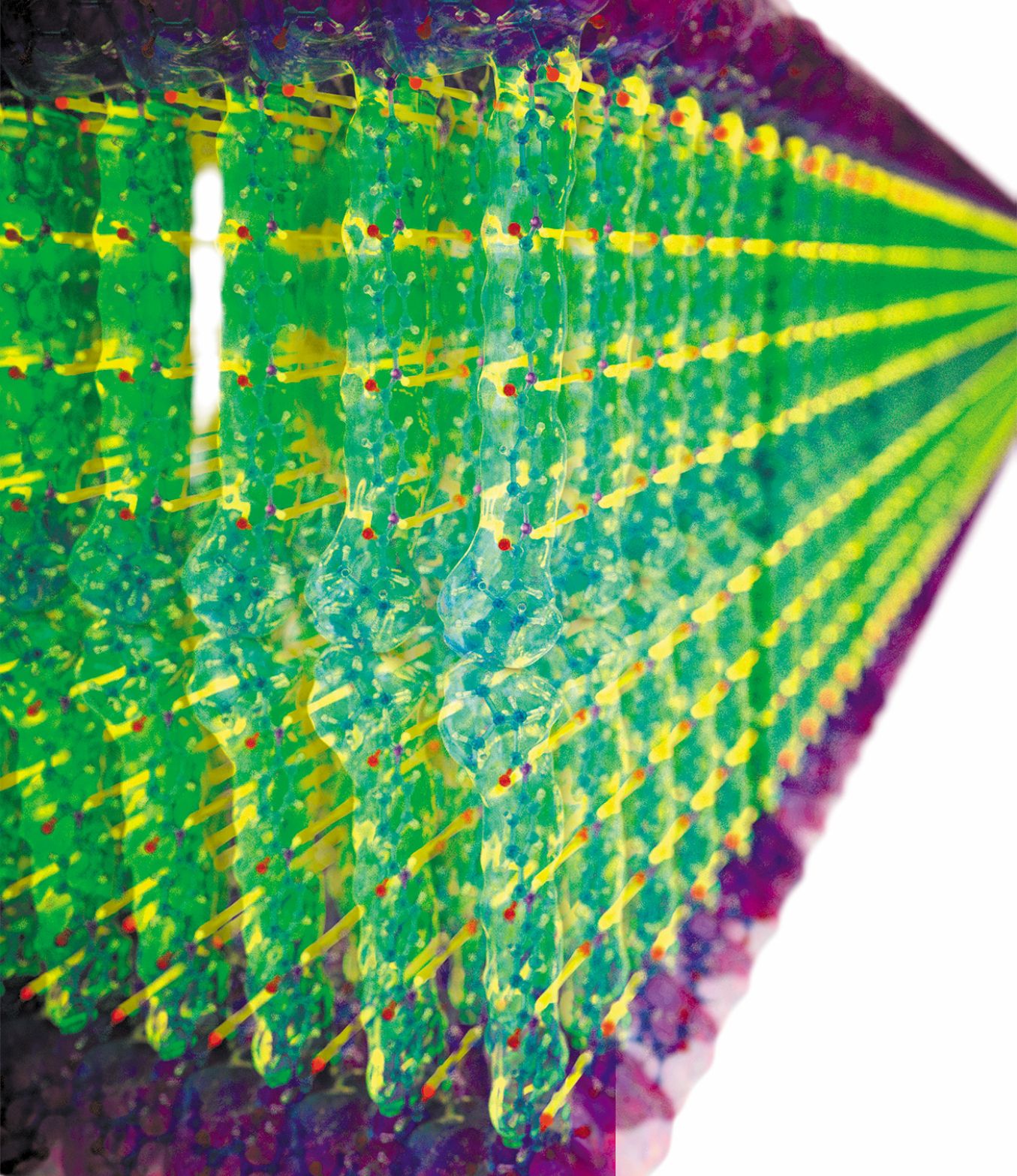The nanoribbons are so much longer than they are wide because the intermolecular interactions are anisotropic: In the ribbon’s long direction, the molecules are held together by hydrogen bonds between the chemical groups shown in yellow; in the short direction, by the less powerful stacking interactions between the benzene rings shown in bright green. To maintain that anisotropy, the hundreds of thousands of amphiphilic molecules in each nanoribbon must all be oriented the same way. That degree of order is unusual among hydrophobically self-assembled materials, which usually see their molecules drift and wiggle around one another and even diffuse in or out of a bilayer on time scales of hours.