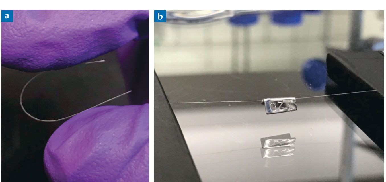 What happens when the nanoribbons are removed from water? To find out, the researchers filled a pipette with a nanoribbon suspension, drew out thin filaments, and allowed them to dry. Instead of collapsing like a soap bubble, the nanoribbons bundled together into resilient solid threads that could be handled and flexed, as seen in figure 2a, and support significant loads, as shown in figure 2b. Although not as strong as Kevlar, the threads constitute a truly solid-state self-assembled material.