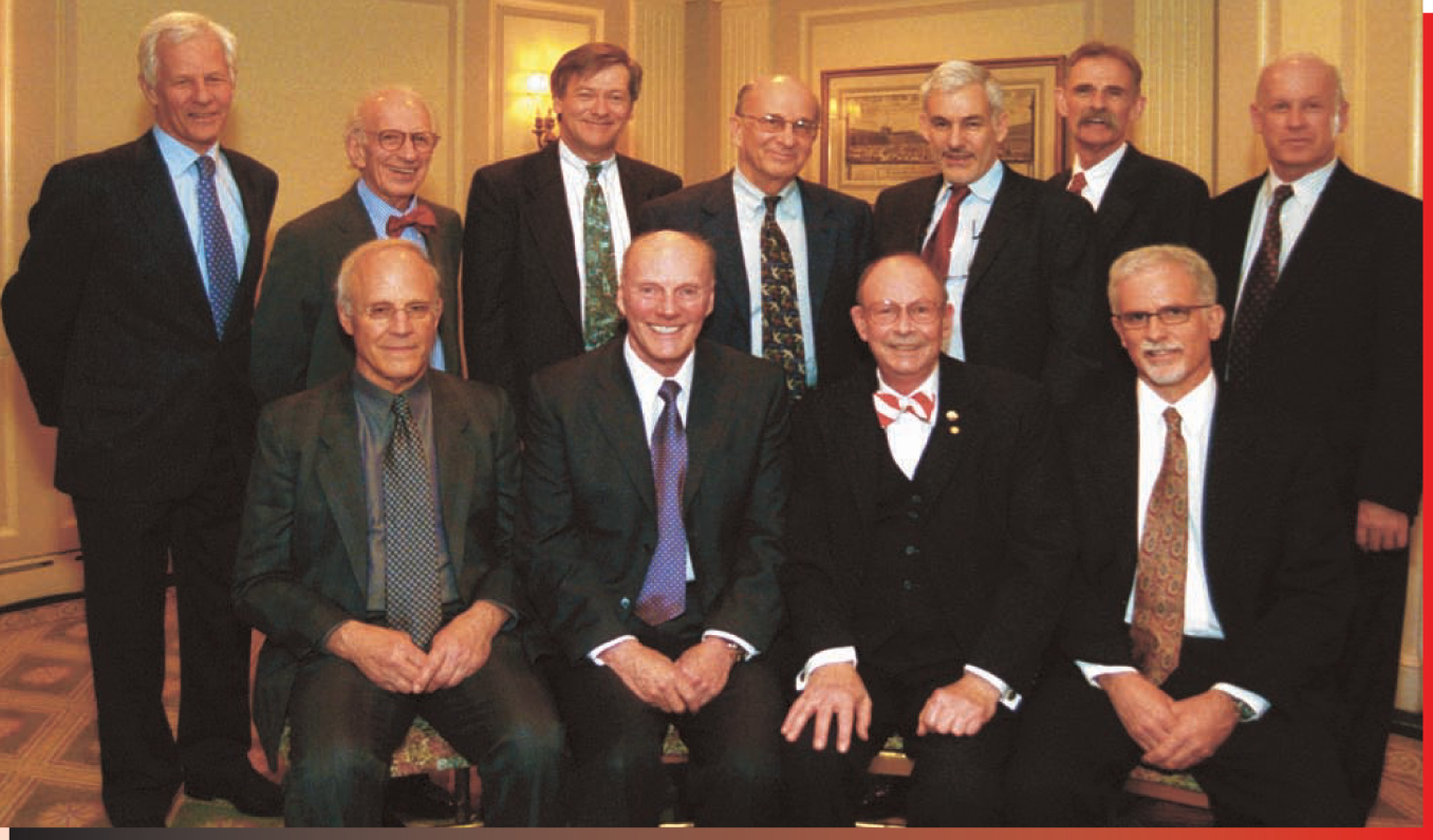 Fred Kavli (front row, second from left) poses with the directors of the Kavli Institutes (clockwise from Kavli): David Gross, University of California, Santa Barbara; Hans Mooij, Delft University of Technology; Eric Kandel, Columbia University; Roger Blandford, Stanford University; Pasko Rakic, Yale University; Bruce Winstein, University of Chicago; Nicholas Spitzer, University of California, San Diego; Jeffrey Elman, University of California, San Diego; Michael Roukes, California Institute of Technology; and Robert Richardson, Cornell University.