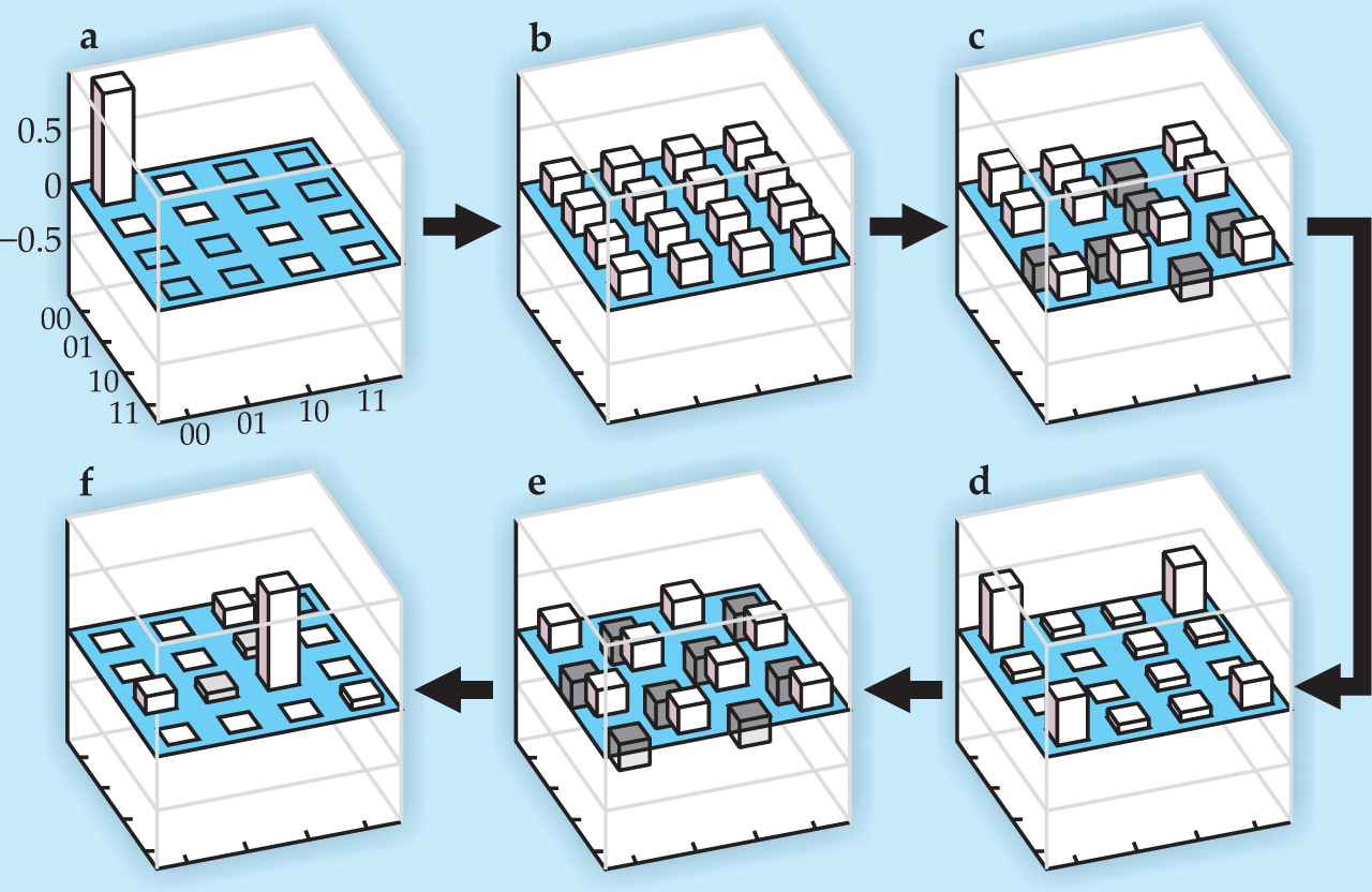 Figure 3. The Grover algorithm is implemented in six steps, shown in clockwise order. Each panel depicts the occupation of each state as a function of the four basis states, |0,0〉, |0,1〉, |1,0〉, and |1,1〉. (a) Both qubits start in the ground state. (b) The qubits are put into maximal superposition states. (c–e) Qubit interactions entangle and unentangle the qubits. (f) The final state contains the correct answer with 85% fidelity.