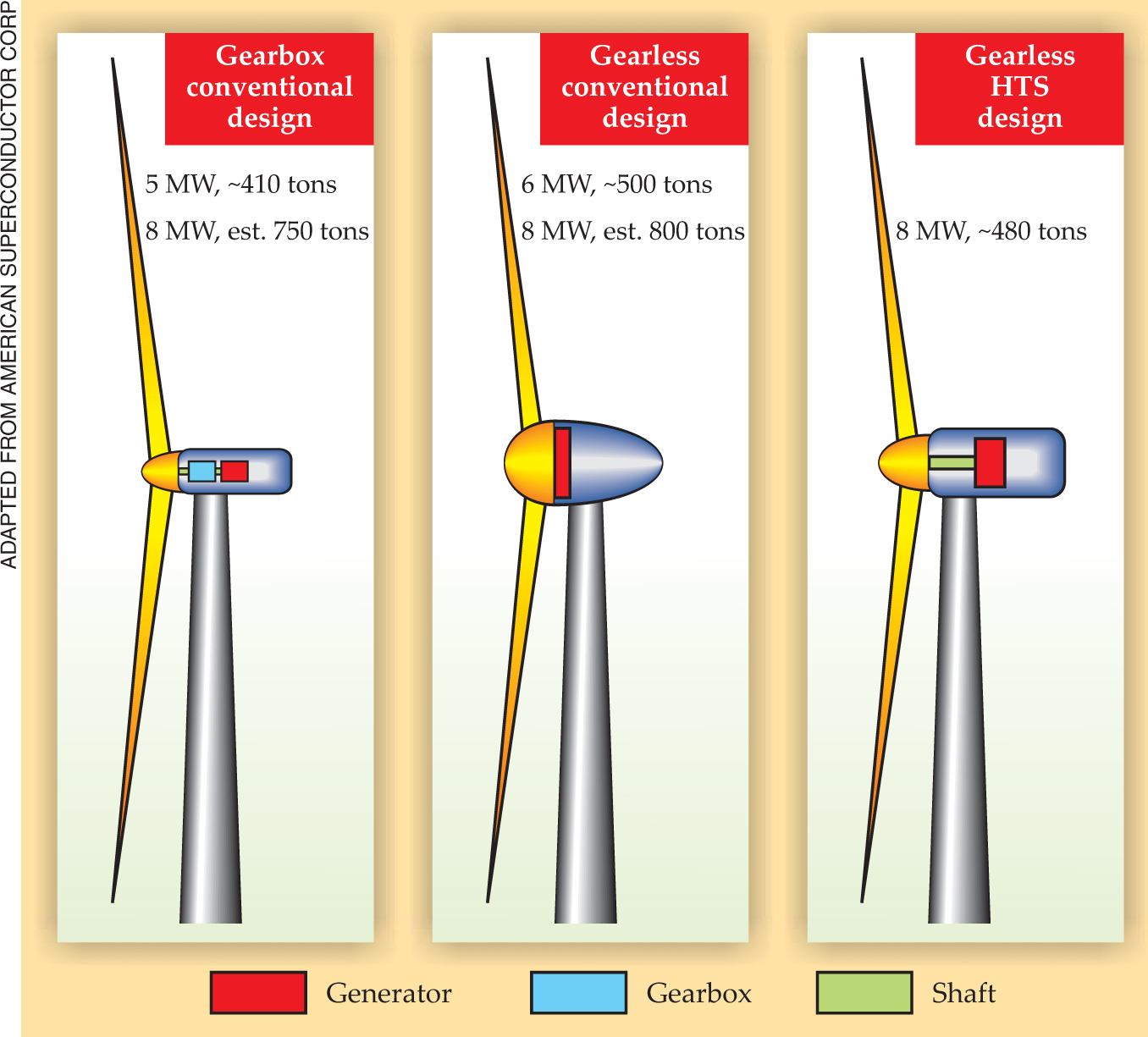 Lightweight, superconducting generators will make possible 8- to 10-MW wind turbines (right) at a fraction of the weight and size that geared (left) and gearless (center) conventional copper-wire generators would have to be.