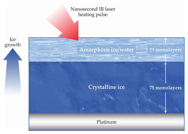Figure 1. Stop-motion crystallization. Researchers at Pacific Northwest National Laboratory observed the rapid crystallization of supercooled water using the 100-monolayer structure illustrated here. A 10 ns IR pulse melts the overlying amorphous-ice layer just long enough for it to partially crystallize at the interface with the underlying crystalline ice; the rest of the layer cools back to the amorphous-ice state. By repeating the pulses and monitoring the growth of new ice, the researchers could tease out crystallization rates and, by extension, dynamic properties of the liquid phase. (Adapted from ref.