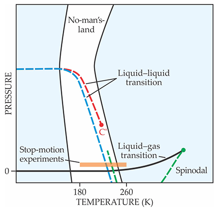 Figure 2. Several phase-diagram features have been hypothesized to explain supercooled water’s behavior in an experimentally challenging “no-man’s-land,” including a liquid–liquid transition curve that terminates at a high-pressure critical point C′ (red); a liquid–liquid transition curve that dips to negative pressures (blue); and a spinodal (green) that decreases, then rises, in pressure as temperature falls. New “stop-motion” experiments exploring no-man’s-land at vacuum pressures (orange bar) find no evidence of a spinodal or a liquid–liquid transition, but they don’t rule out the possibility of a liquid–liquid transition with a high-pressure critical point.