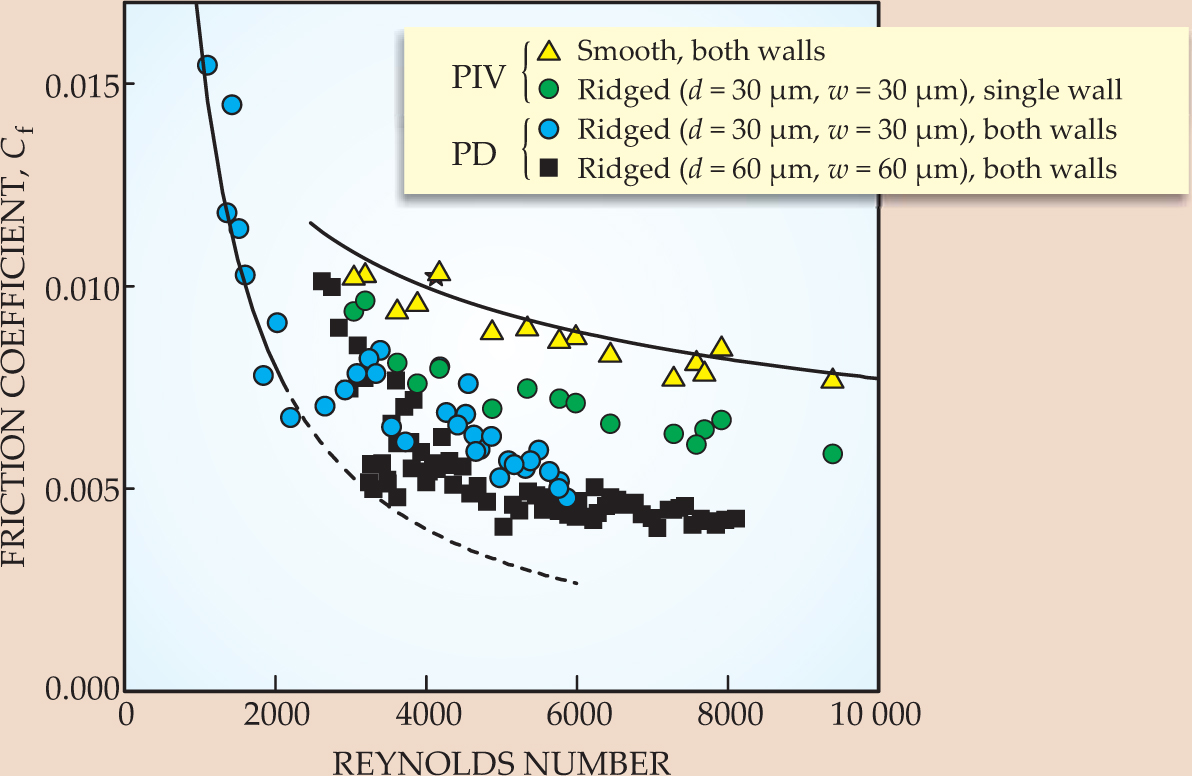 Figure 2. The coefficient of friction C f refers to the shear stress at a wall divided by the kinetic energy density of the flow and is plotted here for various surfaces as a function of Reynolds number. Solid lines indicate the predicted C f along a smooth channel when the flow is laminar (the leftmost curve) and when it becomes turbulent (topmost curve). Data sets are distinguished by whether they are calculated from particle-velocimetry measurements (PIV) or from pressure drops (PD) observed along the channel. The onset of drag reduction occurs in the turbulent regime where the height of the viscous sublayer (about 50 µm) is on the scale of the surface corrugations. Moreover, their effect becomes increasingly pronounced as their width and spacing increase and as both walls (top and bottom) of a rectangular flow channel are made hydrophobic.