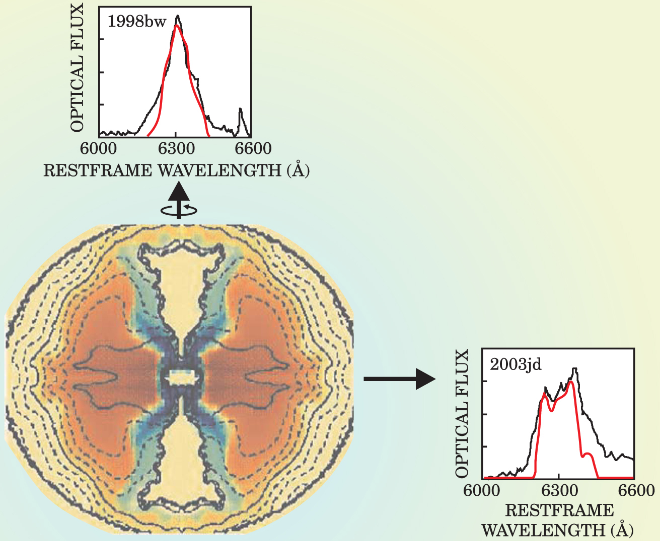 Model simulation of a strongly aspherical type Ic supernova. Orange and green shadings indicate oxygen and iron concentrations, and contour lines show overall density. The simulated explosion yields shapes for the 6300-Å oxygen emission line (red spectral curves in the two panels) that depend on sight line. A polar observer (top) would see a single unshifted peak (after subtracting the supernova’s Hubble redshift). But an equatorial observer (right) would see a red- and blueshifted pair of peaks due, respectively, to the far and near sides of the rapidly expanding, oxygen-rich equatorial torus. If the explosion generated a gamma-ray burst, it would propagate in a narrow polar beam. The black spectral curves in the graphs are measured oxygen lines from two recent type Ic supernovae: SN1998bw did spawn an observed GRB. The double peak from SN2003jd implies that its sight line was approximately equatorial. So if 2003jd did generate a GRB, it would not have propagated in our direction.