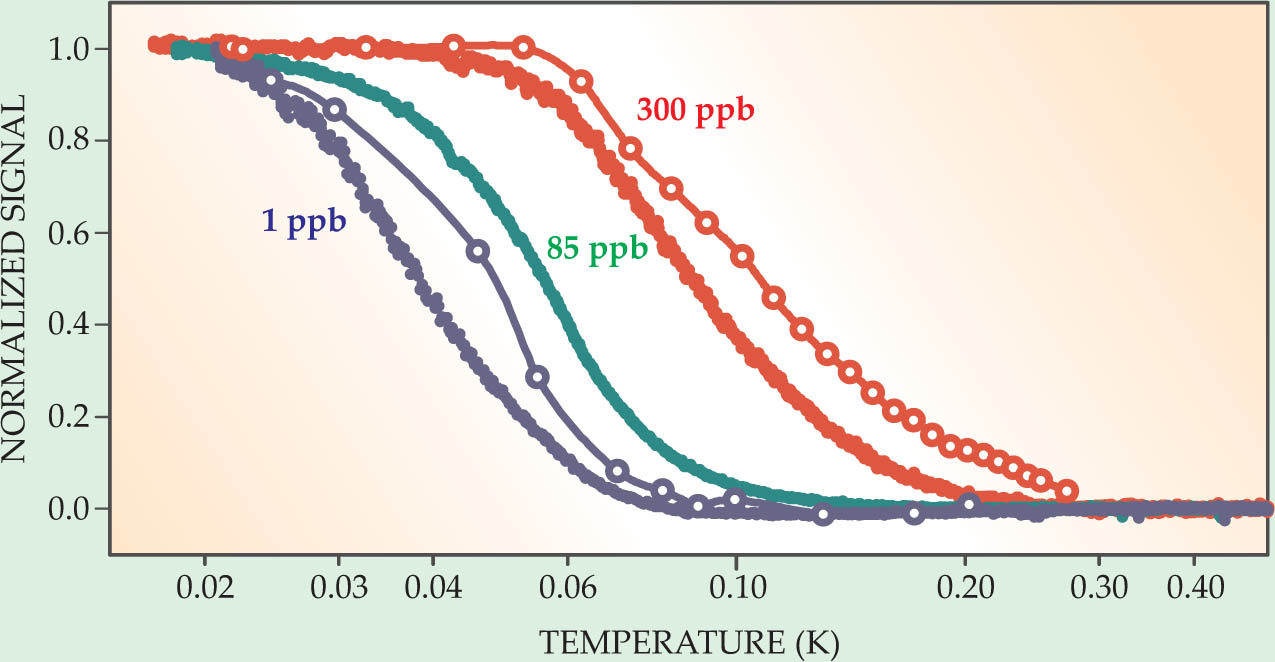Figure 2. Solid helium’s shear modulus (solid curves) and moment of inertia as measured in a torsion oscillator (open circles), as a function of temperature and helium-3 concentration. Each curve is scaled so that its low-temperature value is 1 and its high-temperature value is 0. The highest 3He concentration, 300 parts per billion, is typical of naturally occurring helium. The lowest concentration, 1 ppb, is from an isotopically purified sample. The similarity in temperature- and 3He-dependence is evidence that both measurements are probing the same phenomenon.